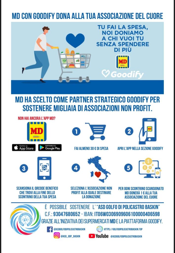 Con i supermercati MD e la piattaforma Goodify, puoi sostenere gratuitamente l’ASD Golfo di Policastro BASKin ogni volta che fai almeno 30€ di spesa!